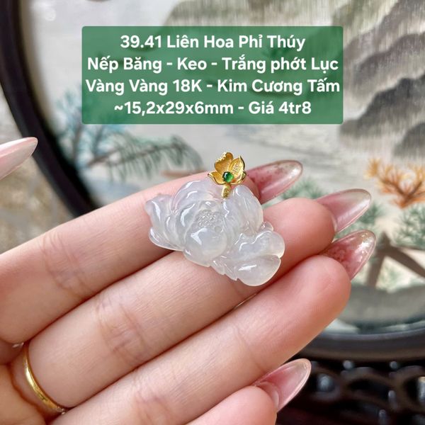 Liên Hoa Phỉ Thúy Nếp Băng - Keo - Trắng phớt Lục VV 18K - KC Tấm ~15,2x29x6mm 39.41