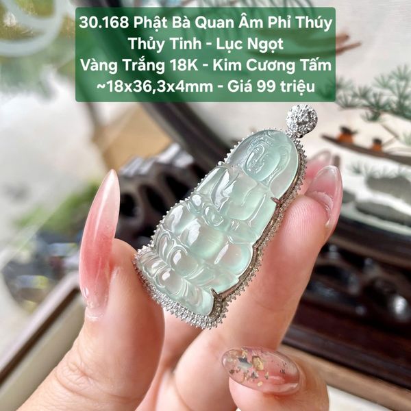 Phật Bà Quan Âm Phỉ Thúy Thủy Tinh Lục Ngọt - Vàng Trắng 18K - Kim Cương Tấm ‣18x36,3x4mm30.168