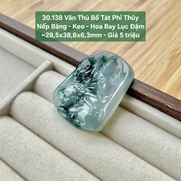 Văn Thù Bồ Tát Phỉ Thúy Nếp Băng - Keo - Hoa Bay Lục Đậm ~28,5x38,8x6,3mm 30.138